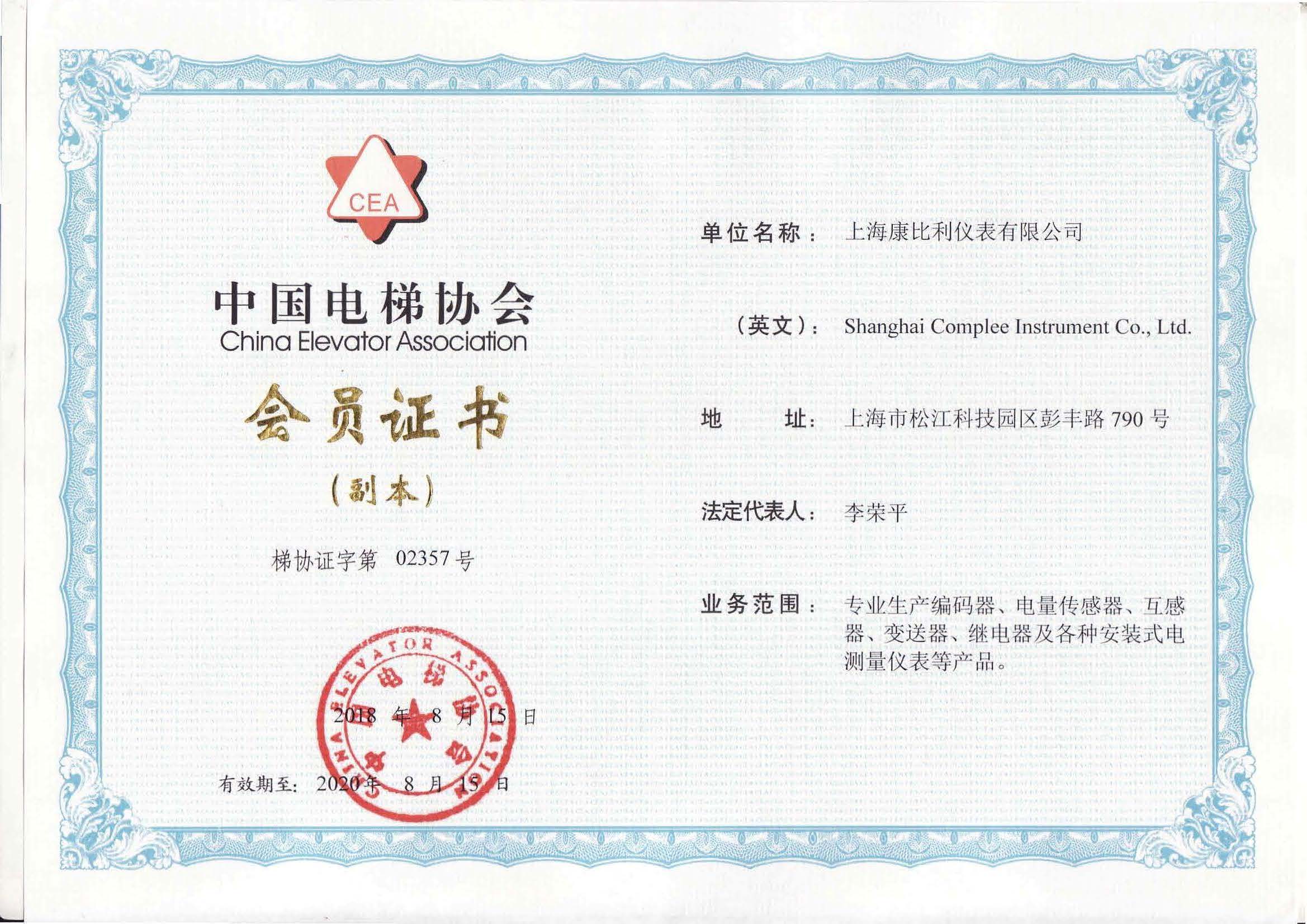 中國電梯協會會員證書
