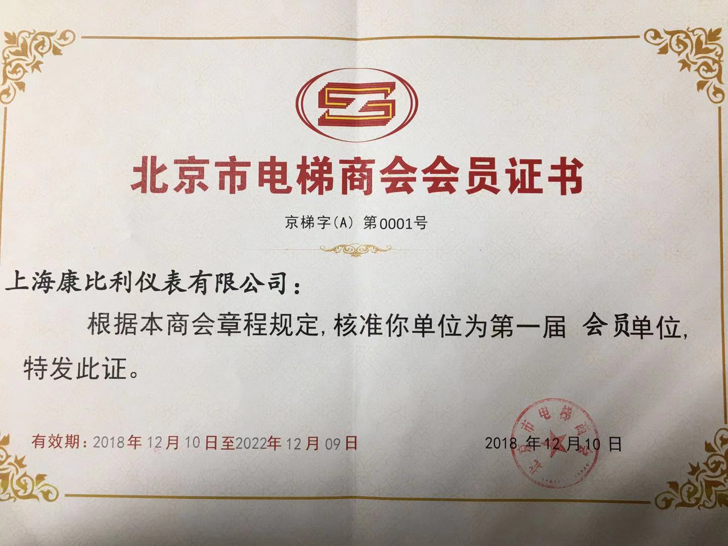 北京市電梯商會會員證書