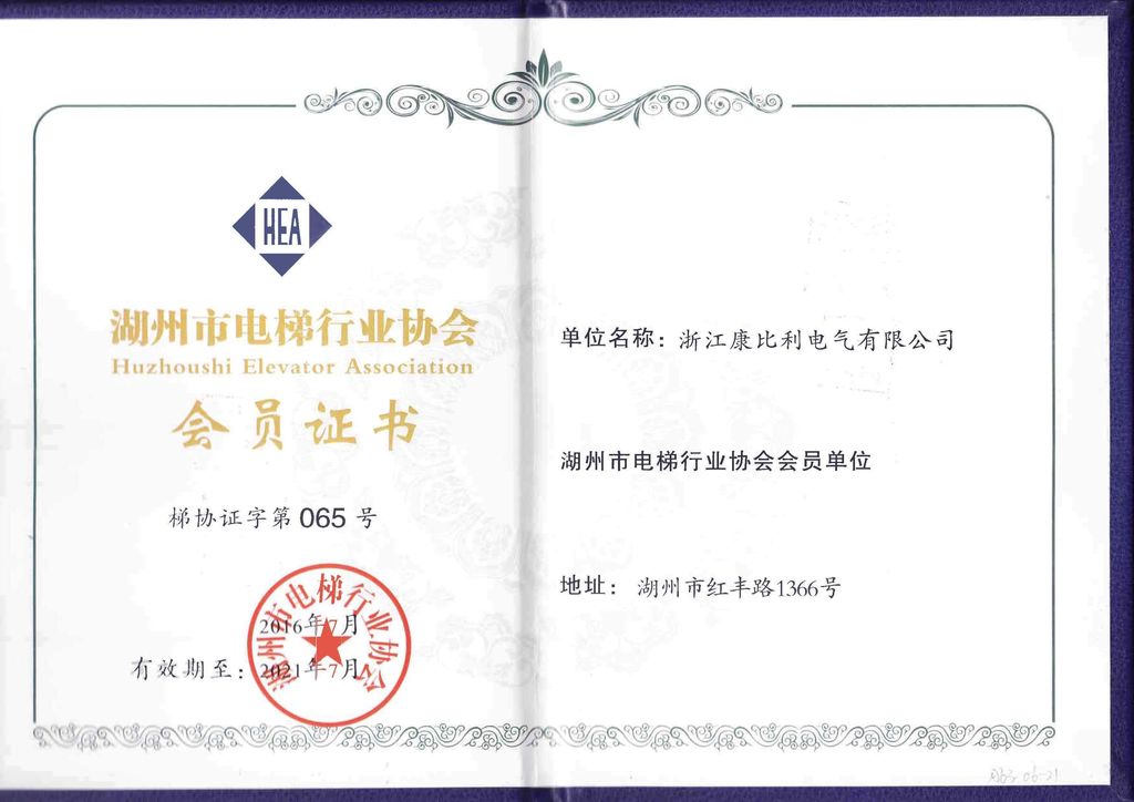 湖州市電梯行業協會會員證書